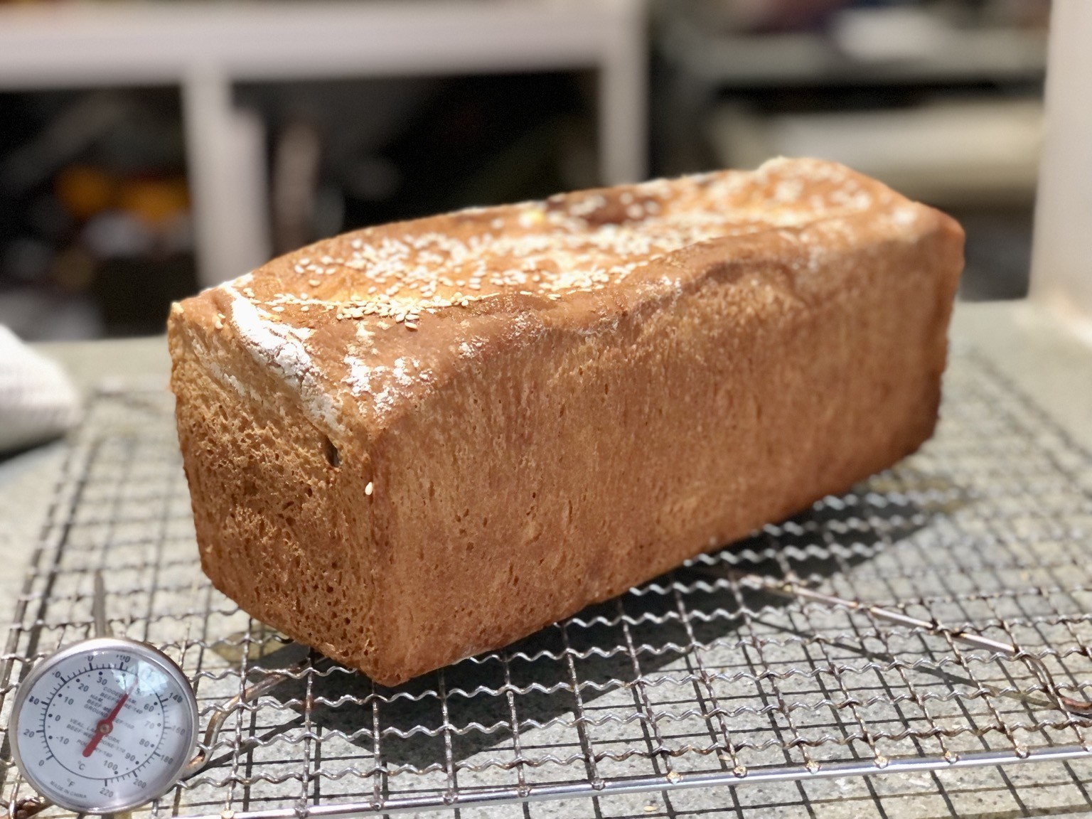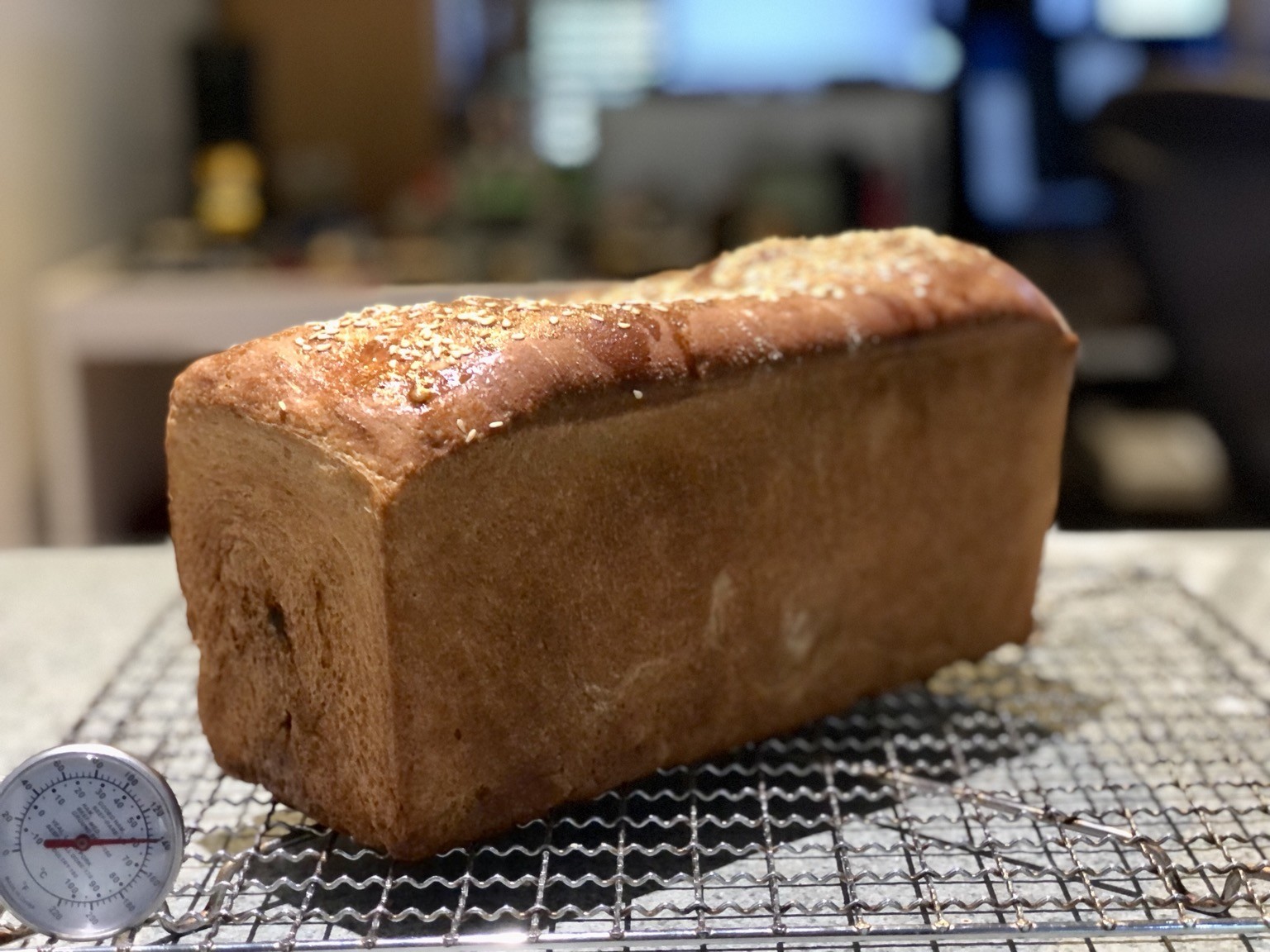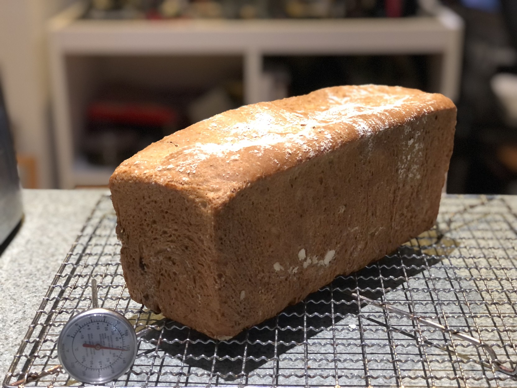 I managed to forget to turn the oven down (usually pre-heat to 220Β°C then turn down to 185Β°C after the initial steam blast for 44mins), so this one baked for 22mins at 220Β°C and 9 mins at 180Β°C. When it cools, Iβll see how that changed (or didnβt) the texture.