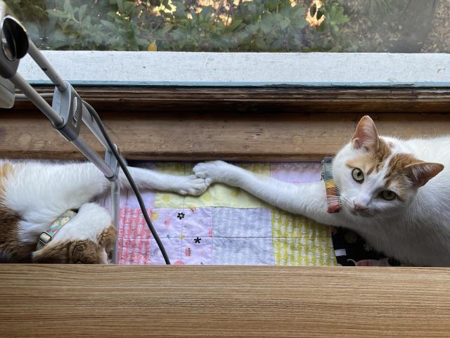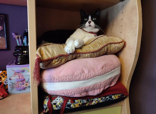 It's a rainy day today so the cats are being extra restless. A play session on my bed was going well until disaster (Petunia) struck. :blobcatcry: