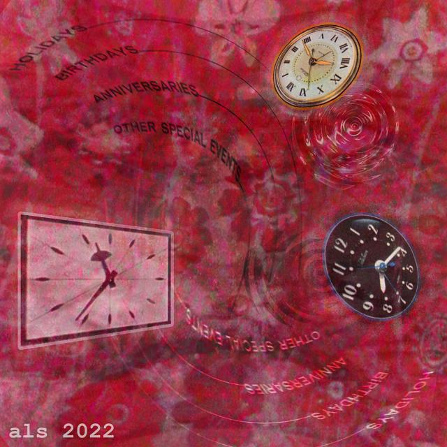 “Time Alone 4” - Pink and red mottled square decorated with random duotone flowers from a glass paperweight. Trim: three different floating clock faces. Text: two curved sets of the words: “Holidays, Birthdays, Anniversaries, Other Special Events” with corresponding curved lines. Black text at left, White text at right.