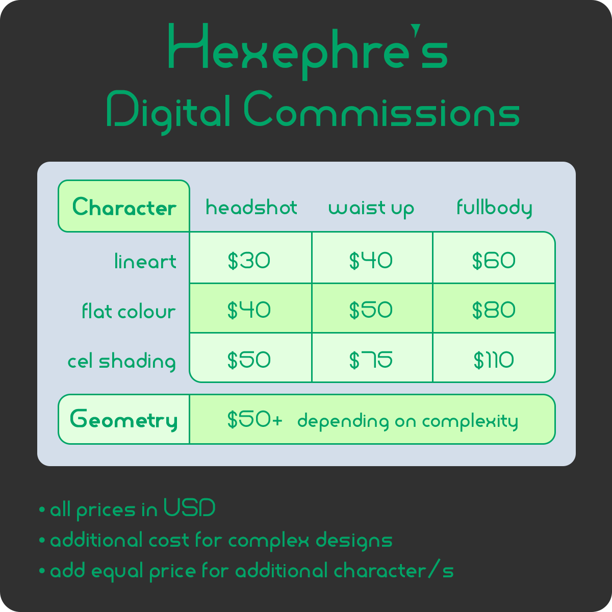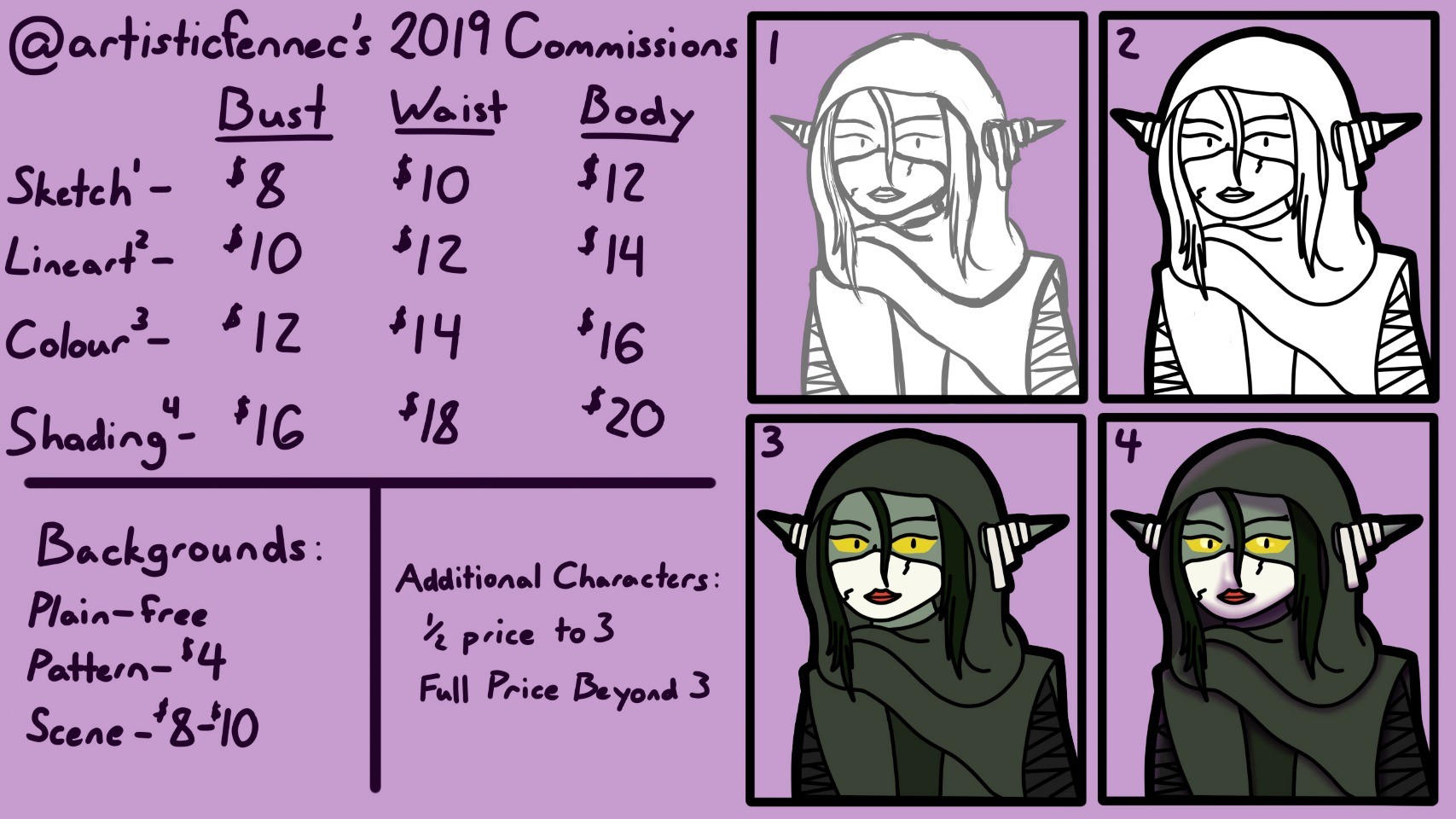 Starting up Commissions again now that things are a little less frantic! So here's a new and updated guide to my prices! If you're interested, DM me! Payment will be via PayPal. Please boost this and help a gal out!~ :sparkles_trans:​ #commisions #commissionsopen #mastoart #art