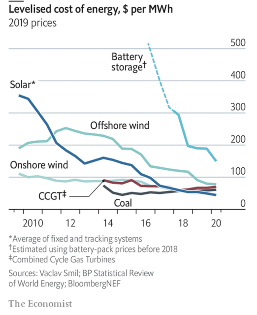 "During the 2010s the levelised cost (that is the average lifetime cost of equipment, per megawatt hour of electricity generated) of solar, offshore wind and onshore wind fell by 87%, 62% and 56%, respectively"