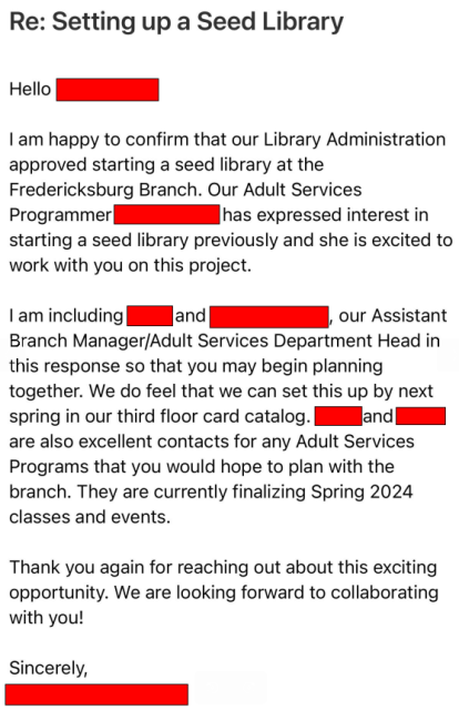 Update on the local Seed Library (see previous posts in this thread for background)!