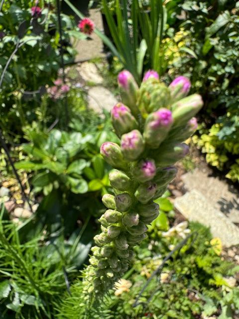 The liatris has these long flower spikes going. Some of the buds are showing a little pink at last. Maybe the bumblebees will start working on opening them.
