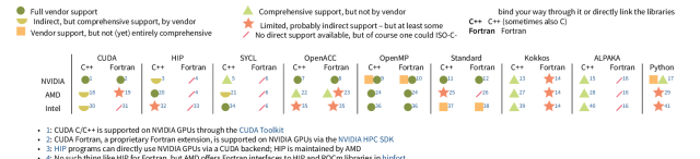 For a recent talk at DKRZ in the scope of the natESM project, I created a table summarizing the current state of using a certain programming model on a GPU of a certain vendor, for C++ and Fortran.Andreas (JSC Accelerating Devices Lab)