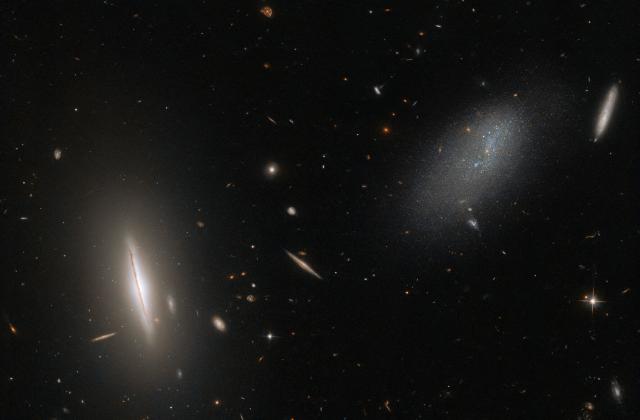 This week's image shows a galactic gathering. On the right, the faint, sparse galaxy LEDA 48062 shines from 30 million light-years away. On the left is a more sharply defined galaxy called UGC 8603: go.nasa.gov/3XaJ9ff