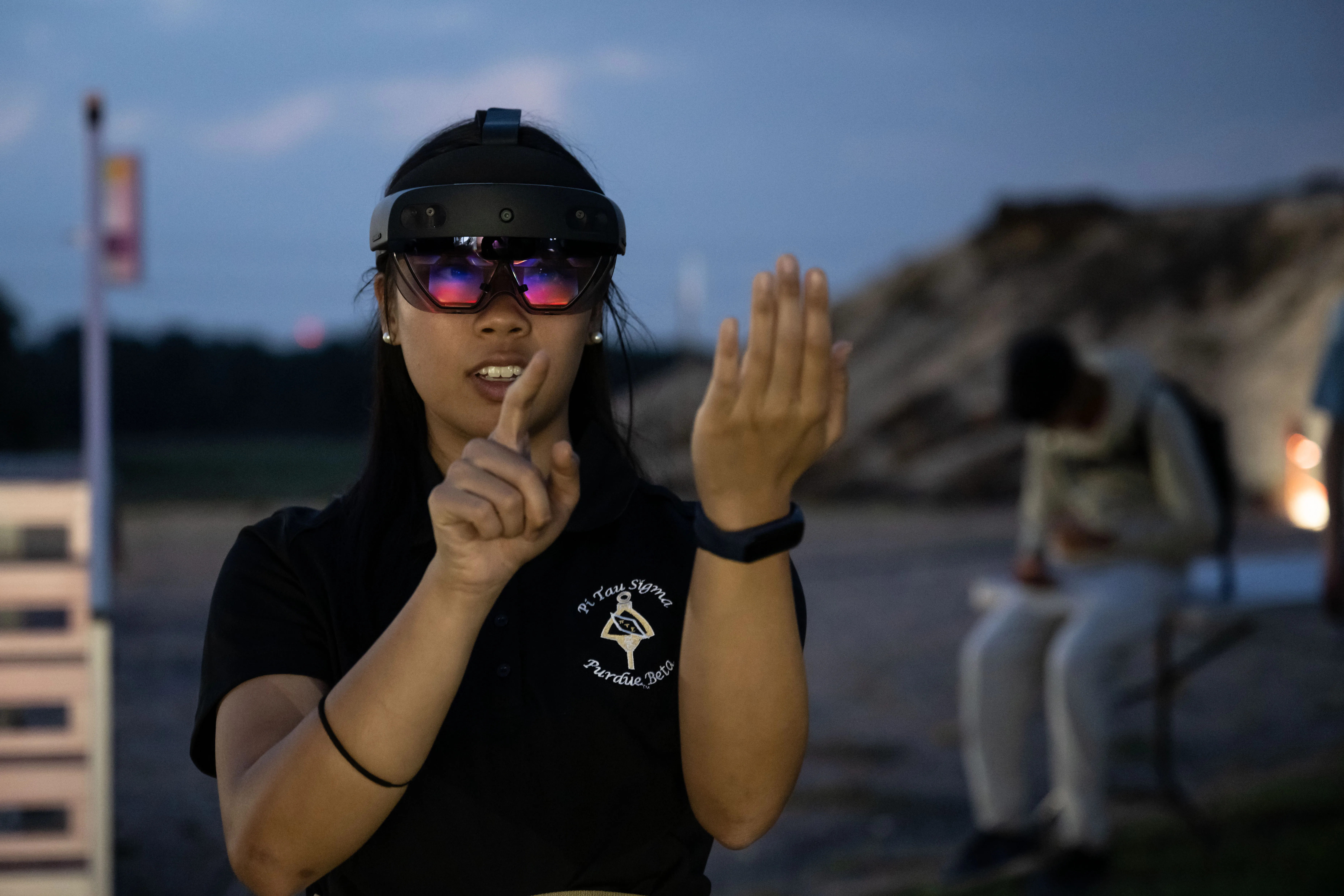 In this image from May 22, 2023, a NASA intern uses an augmented reality headset to test out heads-up display technology being developed for future ArtemisNASA
