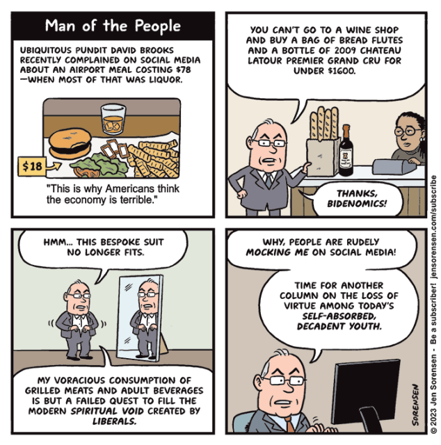 (For those outside the US, the commentator David Brooks has made a career out of piously trolling liberals for their supposed decadence and lack of morals.)