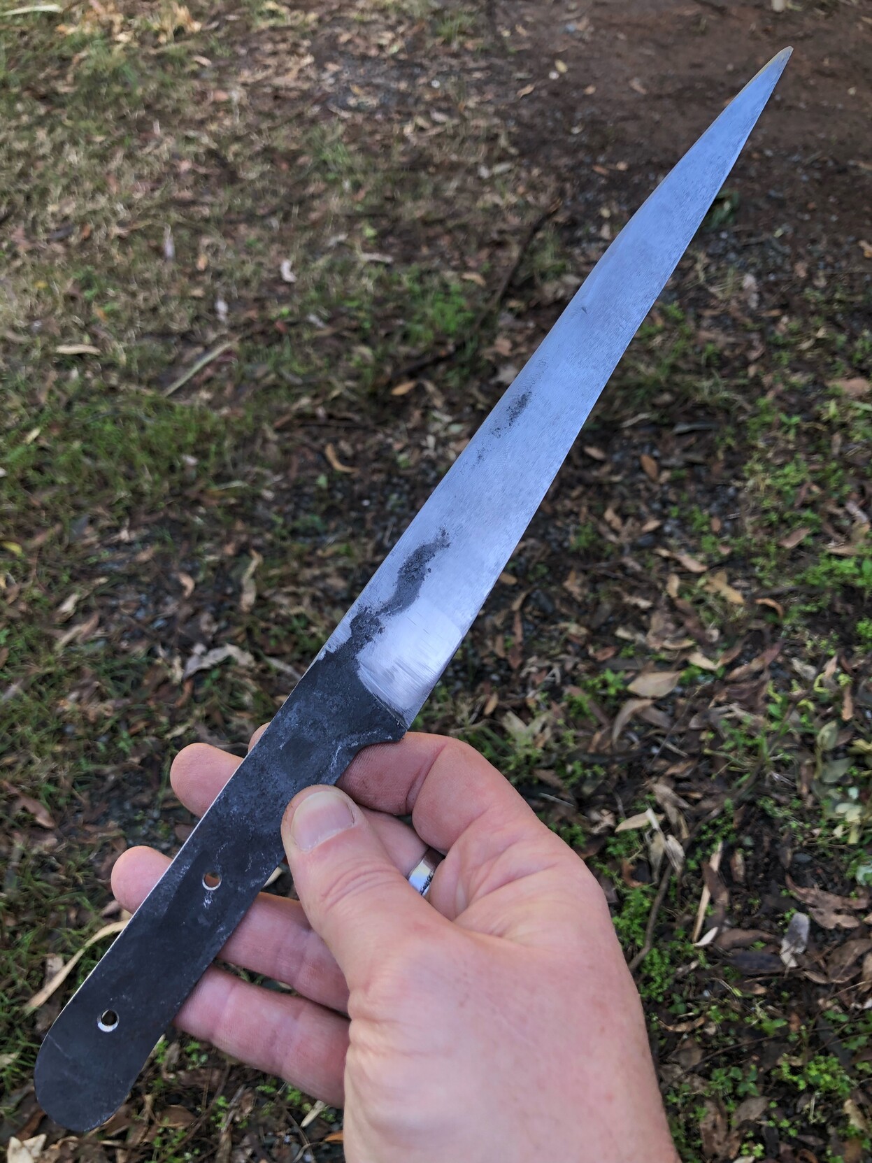 Still needs a bit of straightening and a heat treat, then handle scales, etc.
