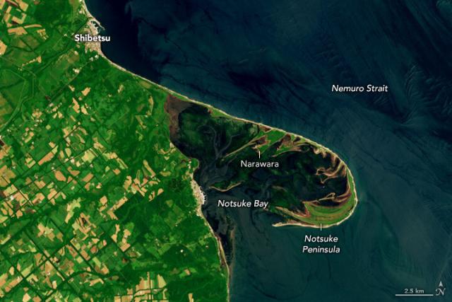 The Nemuro Strait in these #Landsat images is one of the largest sand spits in Japan. In the summer, sea grass and kelp can be seen in Notsuke Bay, while in the winter, the bay’s shallow waters freeze over.