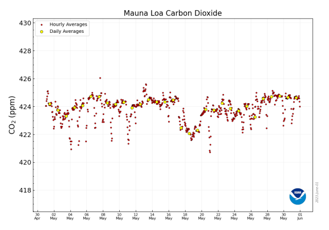 Based on daily data, the atmospheric CO2 concentration at Mauna Loa averaged ~424.0 ppm over May 2023. That's ~3.0 ppm higher than last year, and that's a lot.