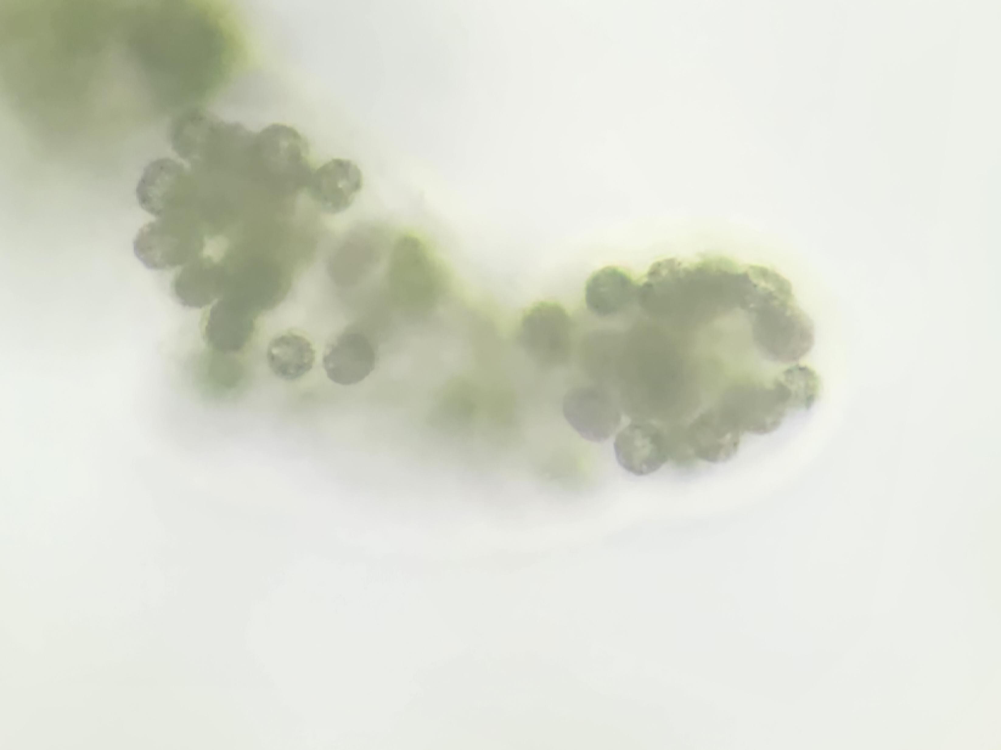Any idea what this algae or plant is? It forms green films on top if a nearby pond. Under the scope it forms largish clumps or sacks of cells- maybe 50-100 um or so across. Seems too large for most algae and too small for plants like duckweed. I've never come across it before, and I'd be curious to get an ID if anyone knew!