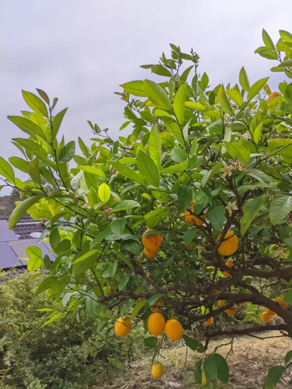 My lemons are a little orange in colour. This photo makes them look even more orangey. We live on the side of a hill, and you can see the solar panels on our roof peaking under the branches.