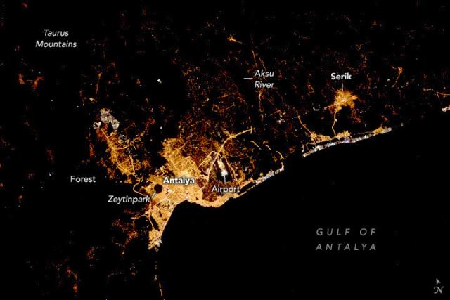 An astronaut aboard the @Space_Station took this nighttime photograph of the coastal Mediterranean city of Antalya, Türkiye in September 2022, showing the sharp contrast between urban infrastructure and natural areas. go.nasa.gov/3q5u43v