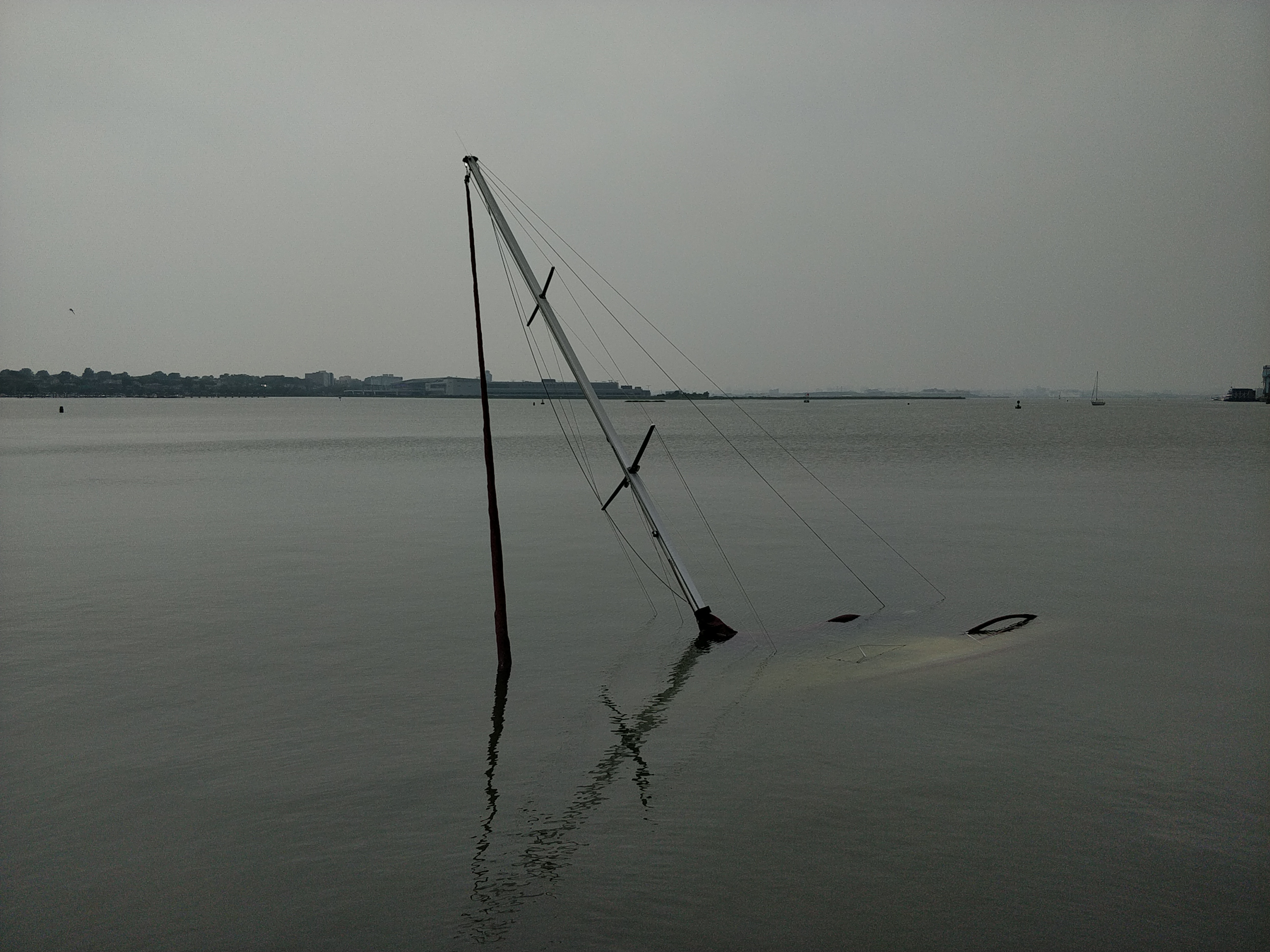 Went for a walk along the #flushing bay promenade yesterday and found this capsized #boat! So odd... I wonder what the story is. There were lots of wildlife in the bay too enjoying the fish and the quiet. #queens #nyc