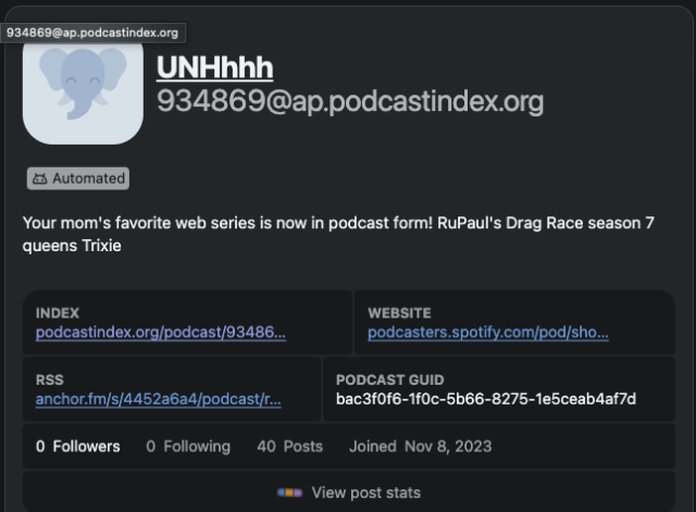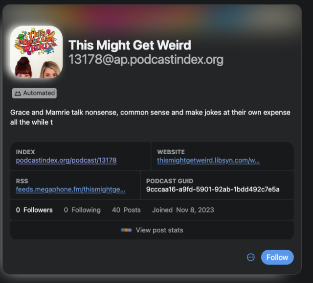 The Podcast Index has an ActivityPub implementation, and now I can follow some of my more irreverent non-techie podcasts directly on the fediverse. So cool! Hopefully they'll add a Follow button soon...but in the meantime: