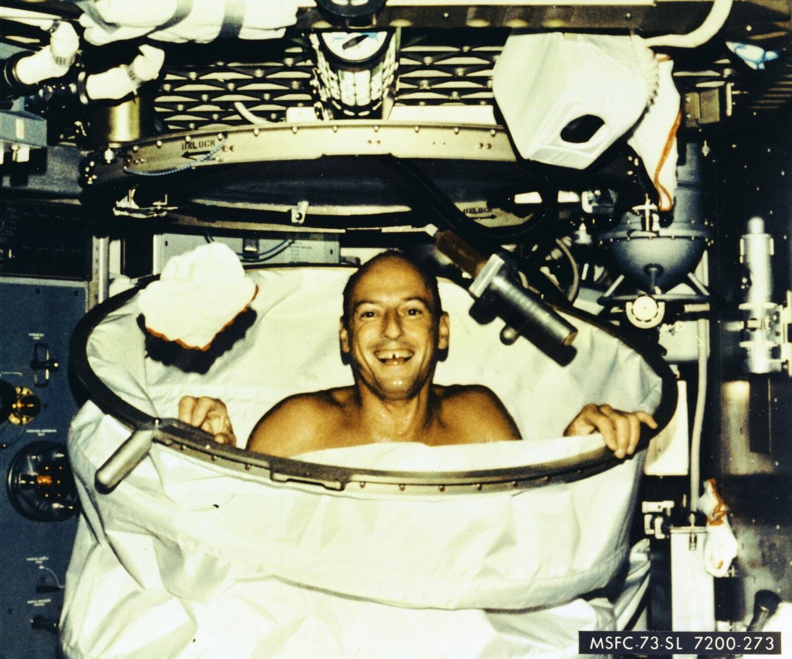 One of the most colorful of NASA's first astronauts, Pete Conrad, veteran of the Gemini 5, 11, and Apollo 12 missions, was also the commander of Skylab 2. In this photo taken 50 years ago today, he tries out the Skylab shower. #Skylab50