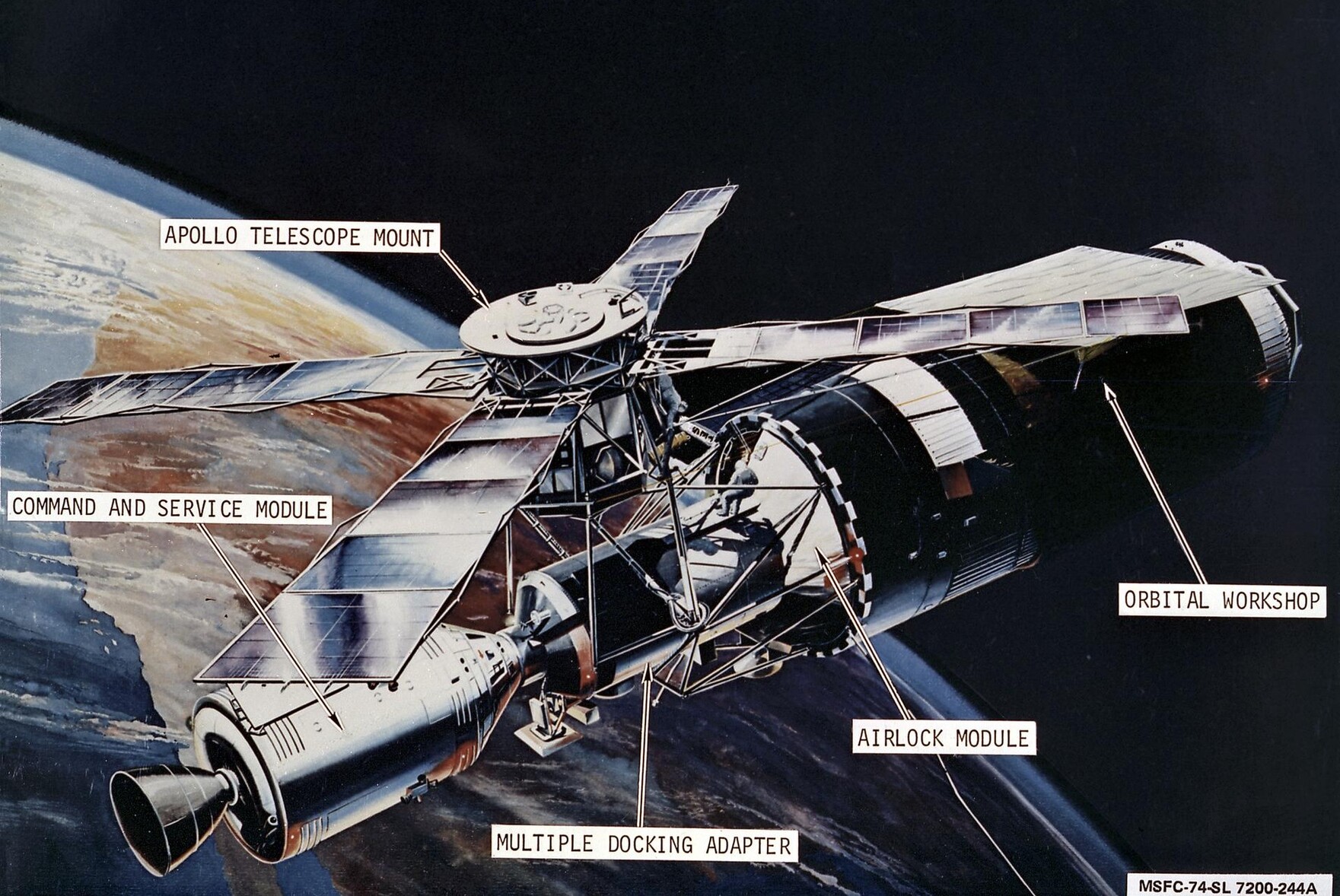 The protective shield of the Orbital Workshop was missing, one of the solar arrays was gone, and the other only partially deployed. #Skylab50