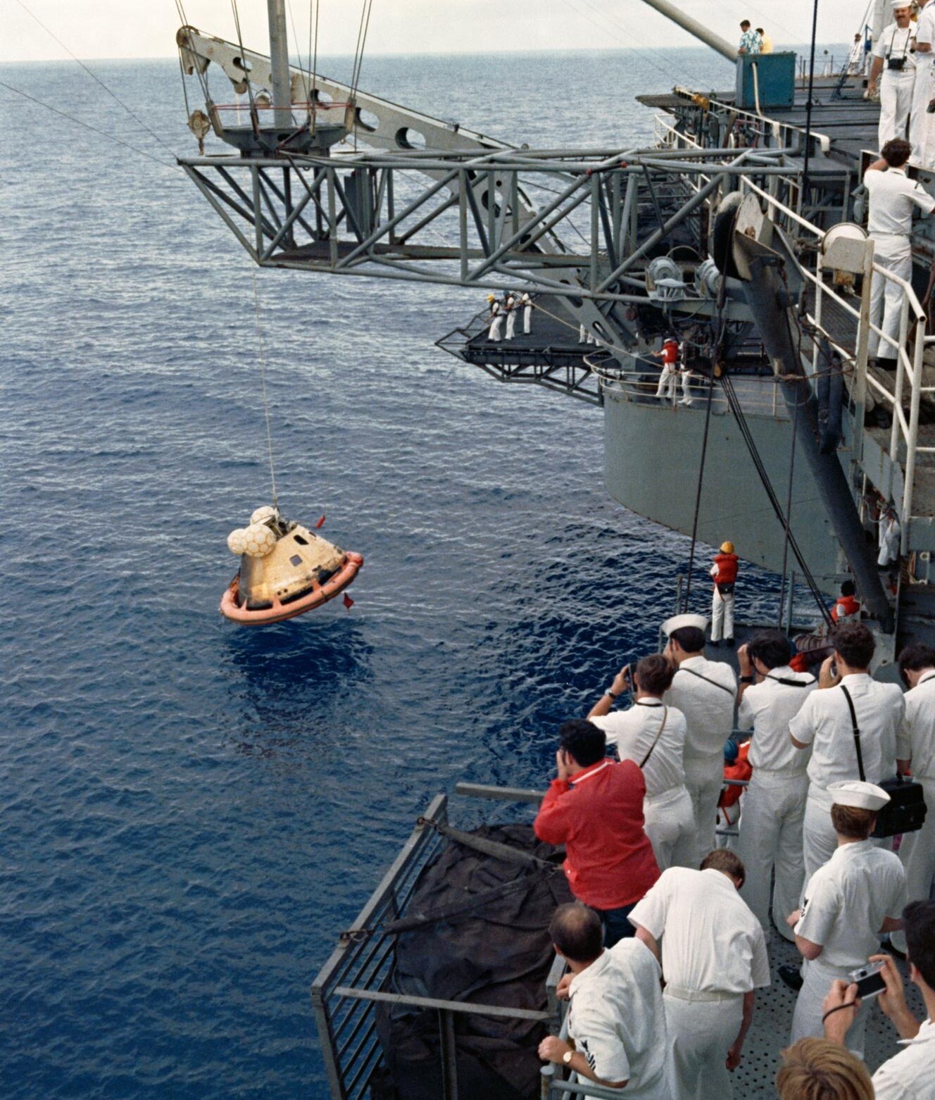 Skylab 2 astronauts Commander Charles “Pete” Conrad, Pilot Paul J. Weitz, and Science Pilot Joseph P. Kerwin, completed their record-setting 28-day mission on June 22, 1973, with a splashdown in the Pacific Ocean. Recovery teams from the U.S.S.Kelli Mars (NASA)