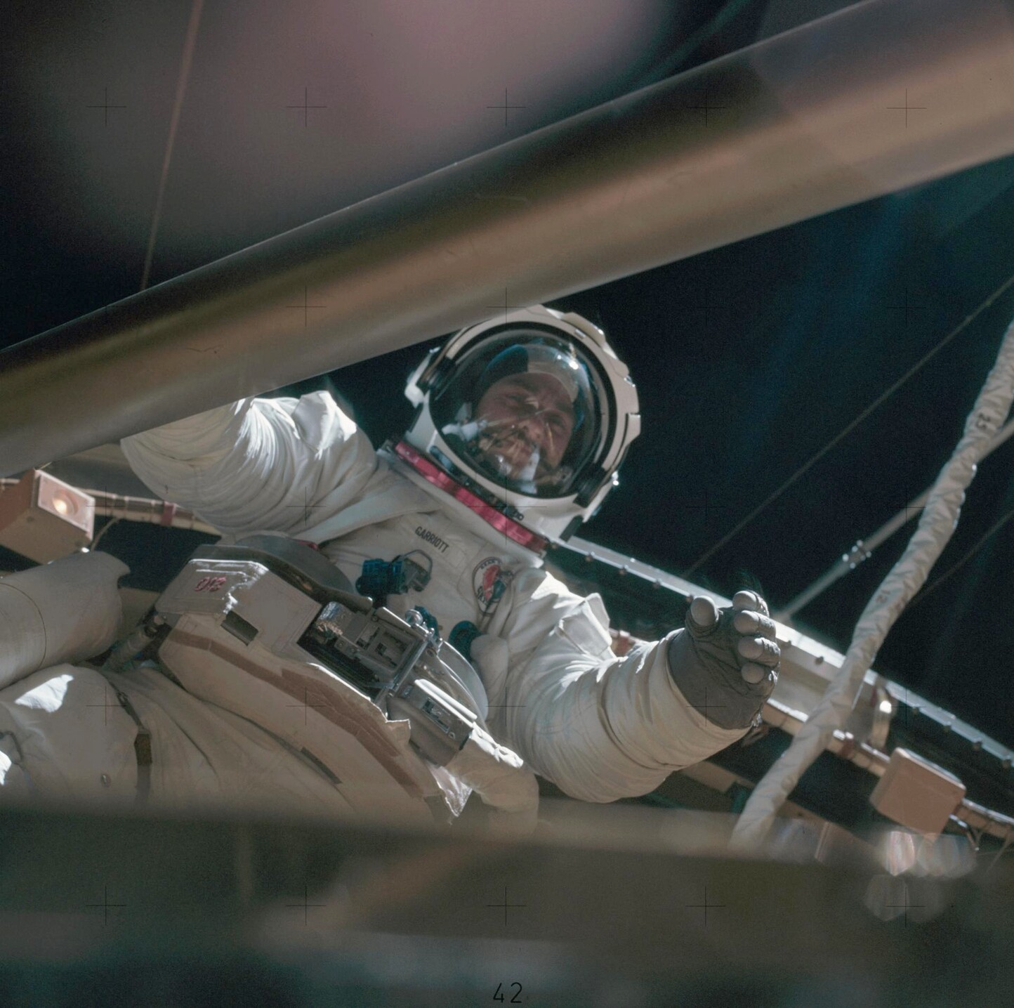 Owen Garriott (shown here) and his Skylab 3 crewmates performed a nearly 6.5 hour spacewalk #OTD in 1973 to install a 2-pole sunshade, change the film on the Apollo Telescope Mount, and install and repair equipment for experiments. #Skylab50