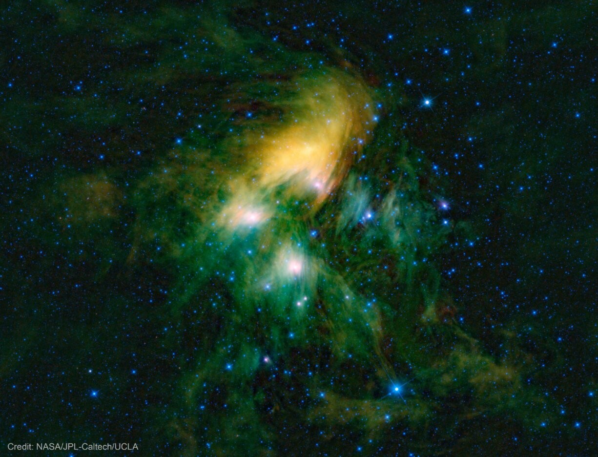 This image shows the famous Pleiades cluster of stars as seen through the eyes of NASA's Wide-field Infrared Survey Explorer; they are what astronomers call an open cluster of stars, loosely bound to each other to eventually go their separate ways.NASA Jet Propulsion Laboratory (JPL)