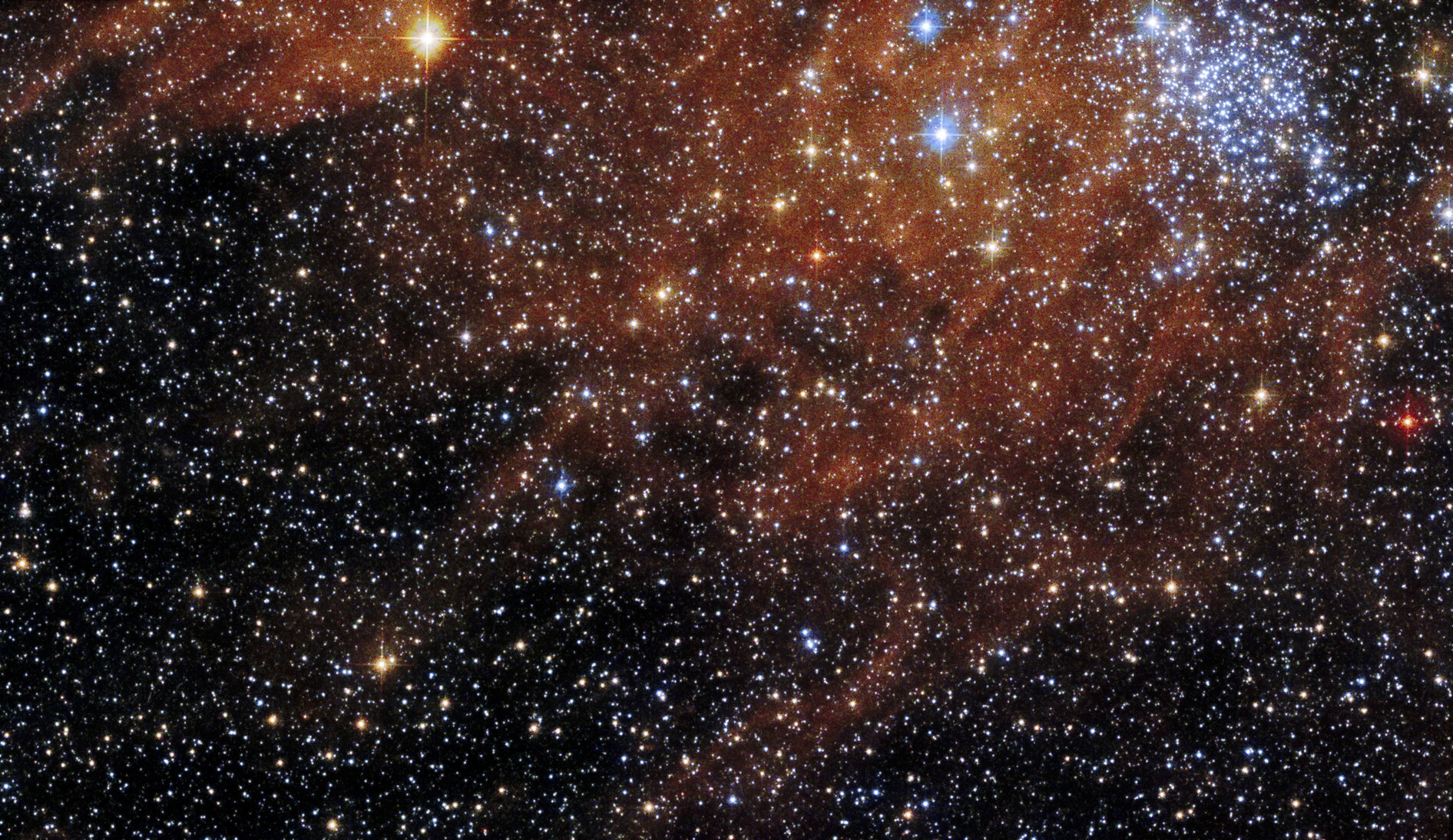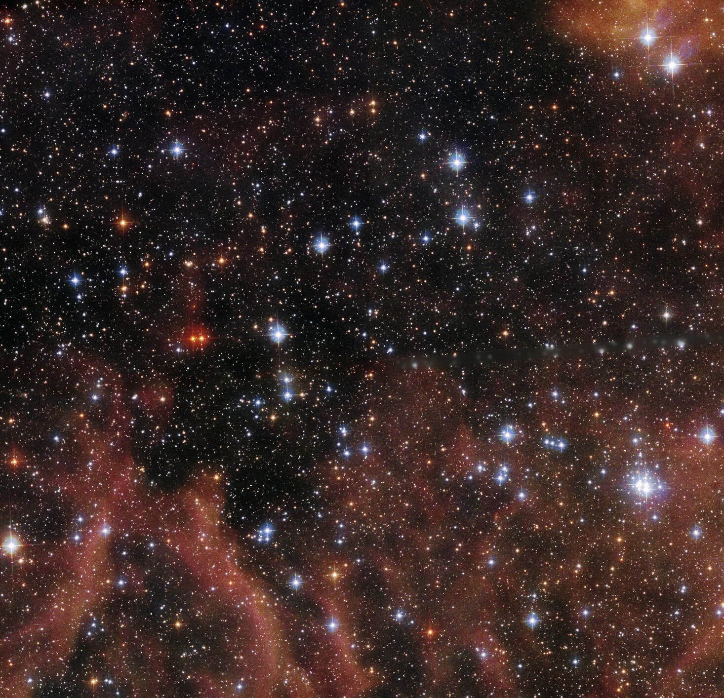 Bright, blue-white stars of the open cluster BSDL 2757 pierce through the rusty-red tones of gas and dust clouds in this NASA Hubble Space Telescope image.Andrea Gianopoulos (NASA)